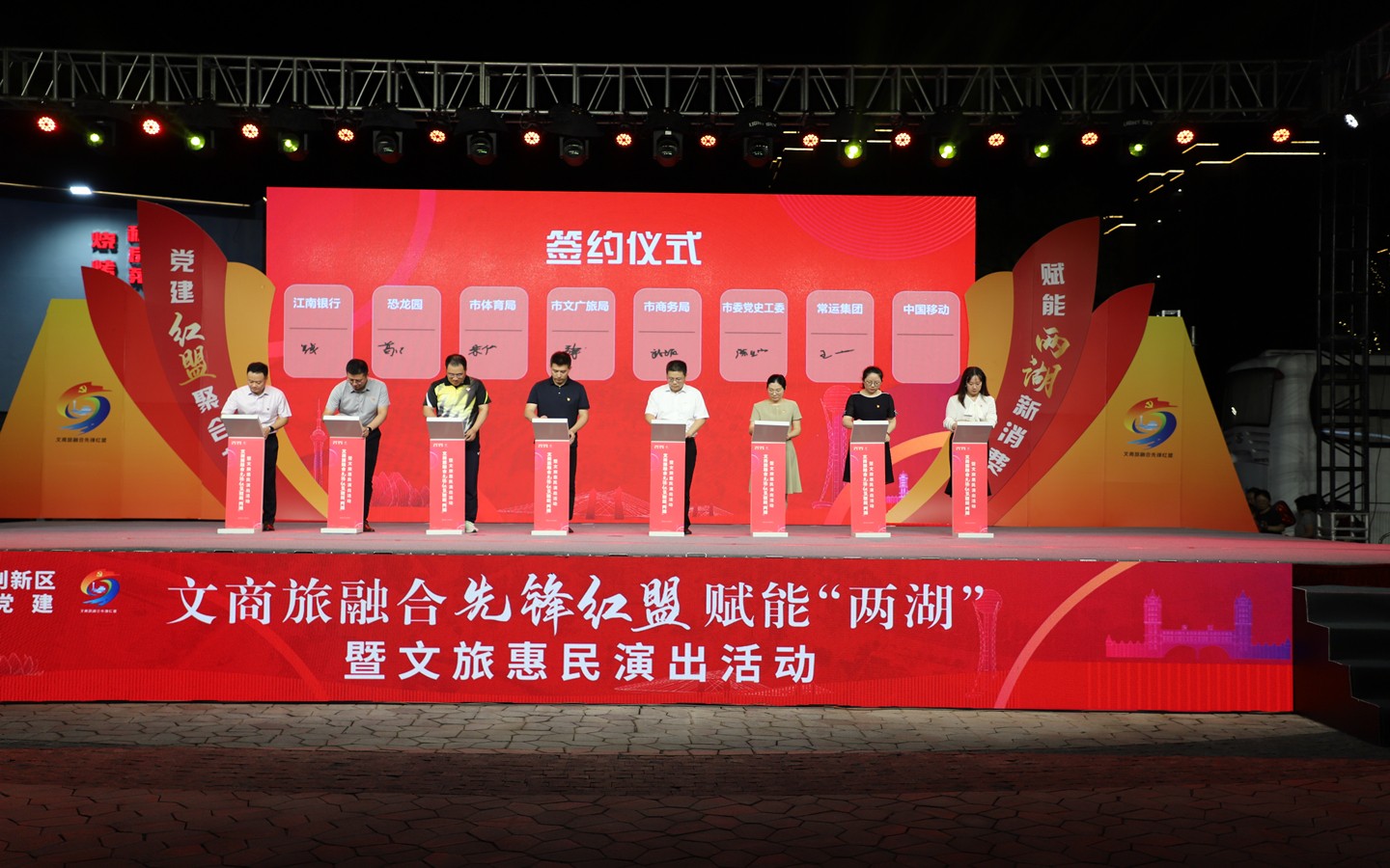 9月13日晚,“黨建紅盟聚合力、賦能兩湖新消費”文商旅融合先鋒紅盟賦能“兩湖”暨文旅惠民演出活動在藍海豚文化藝術街區(qū)成功舉行。市級機關工委書記趙天晟,副書記潘奕,市文廣旅局黨組書記、局長嚴俊,市商務局黨組書記、局長韓雪琴,市黨史工委主任柯善學等領導出席活動;金壇、武進、鐘樓區(qū)文旅(體育)、商務、黨史部門領導及恐龍園、江南銀行、常州移動等紅盟單位重點企業(yè)領導參加活動。集團公司黨委書記、總經理朱平春、副總經理黃細富等領導及街區(qū)商管公司相關人員參加活動。