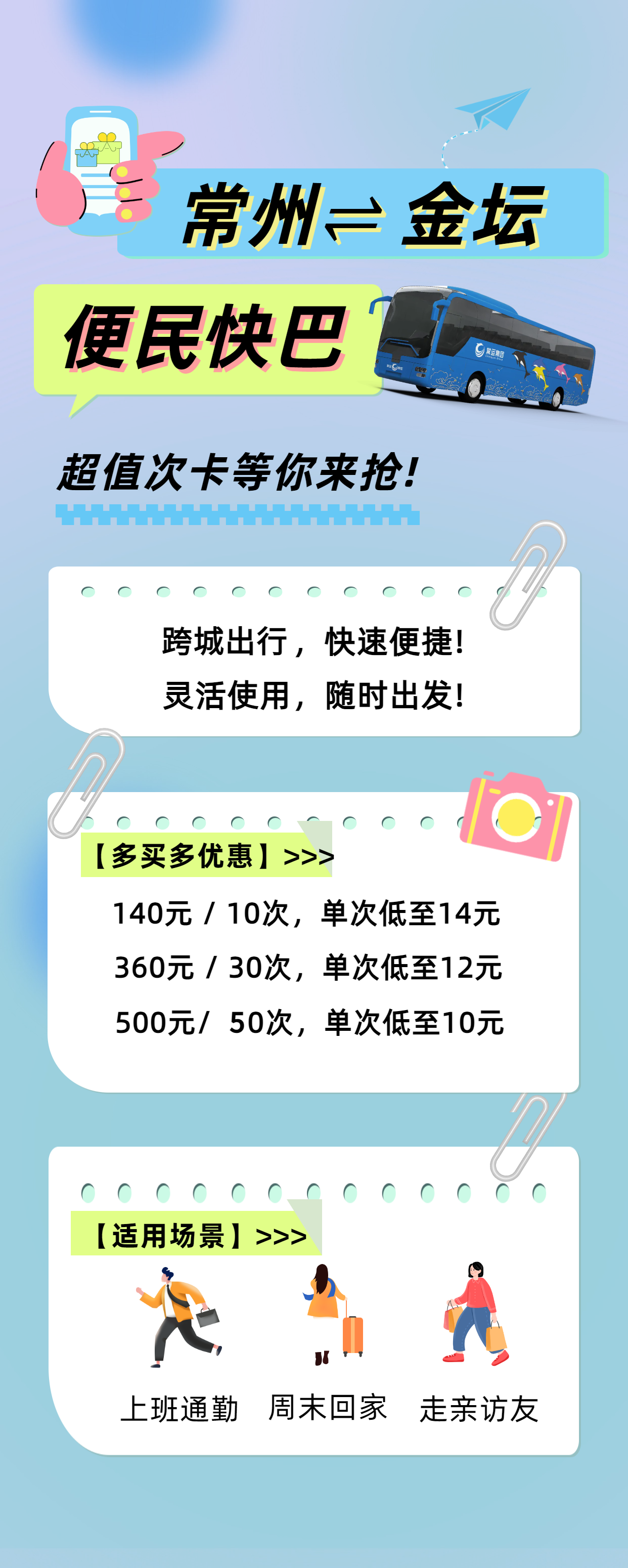 為進一步提升出行體驗,常州至金壇便民快巴近日推出超值次卡,為廣大市民提供更加優(yōu)惠、便捷的出行選擇。此次推出的次卡共分為三檔:140元10次、360元30次、500元50次,具體購買及使用方式可關注“常州汽車站”公眾號了解詳情。